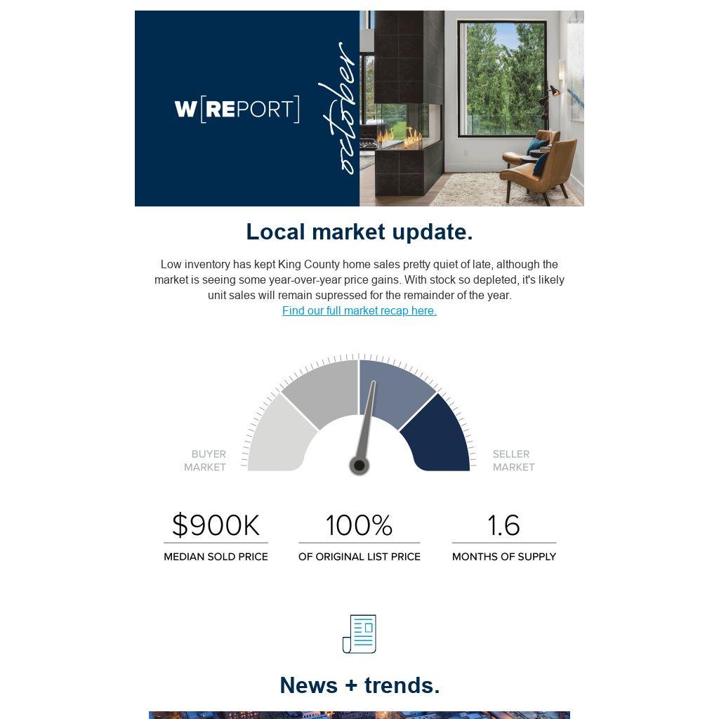 Low inventory has kept King County home sales pretty quiet of late, although the market is seeing some year-over-year price gains. With stock so depleted, it's likely unit sales will remain supressed for the remainder of the year. Find our full market recap here.