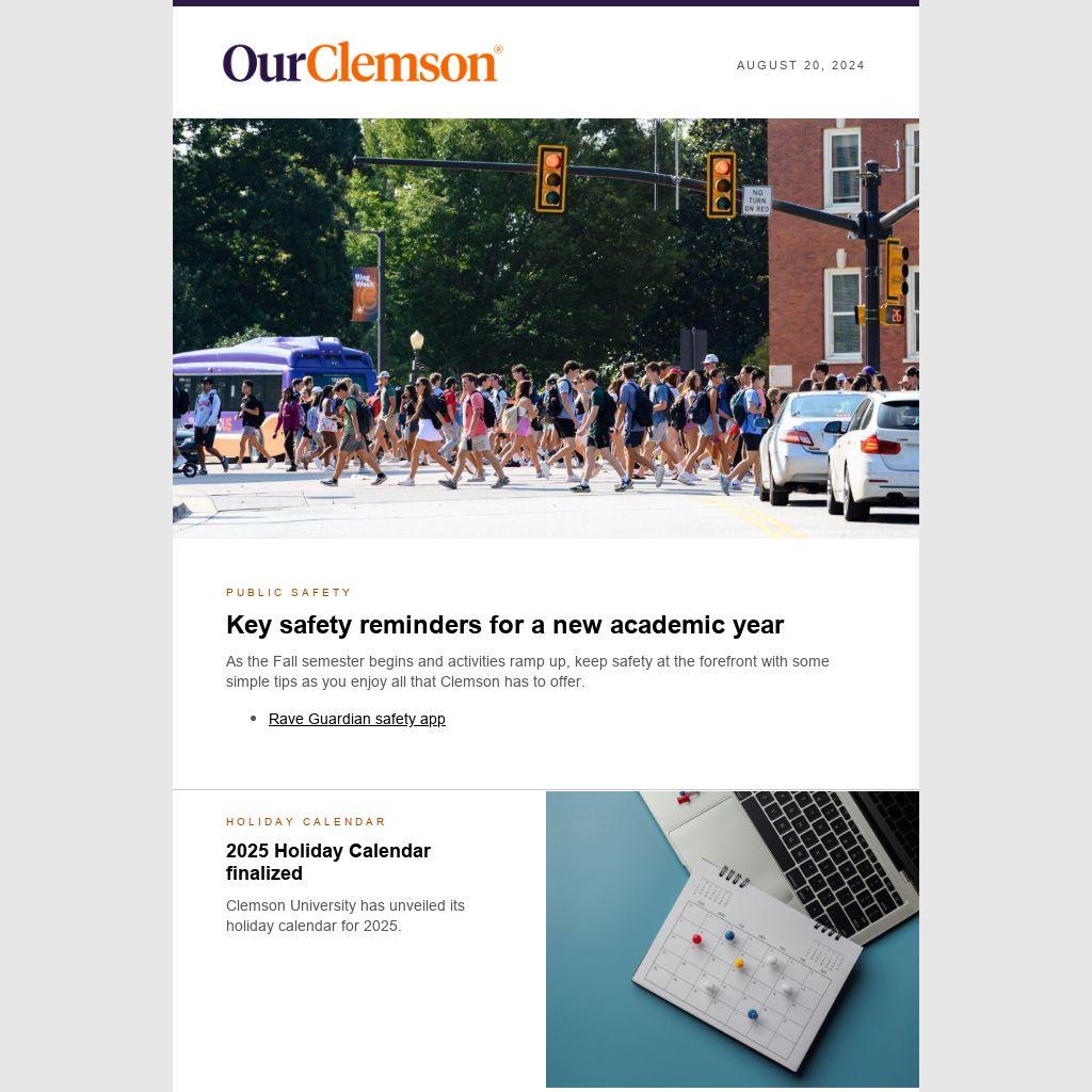 As the Fall semester begins and activities ramp up, keep safety at the forefront with some simple tips as you enjoy all that Clemson has to offer.