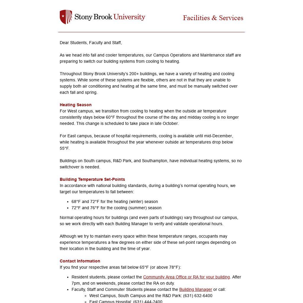 As always, Facilities & Services personnel will work to address any temperature concerns you have throughout the year.