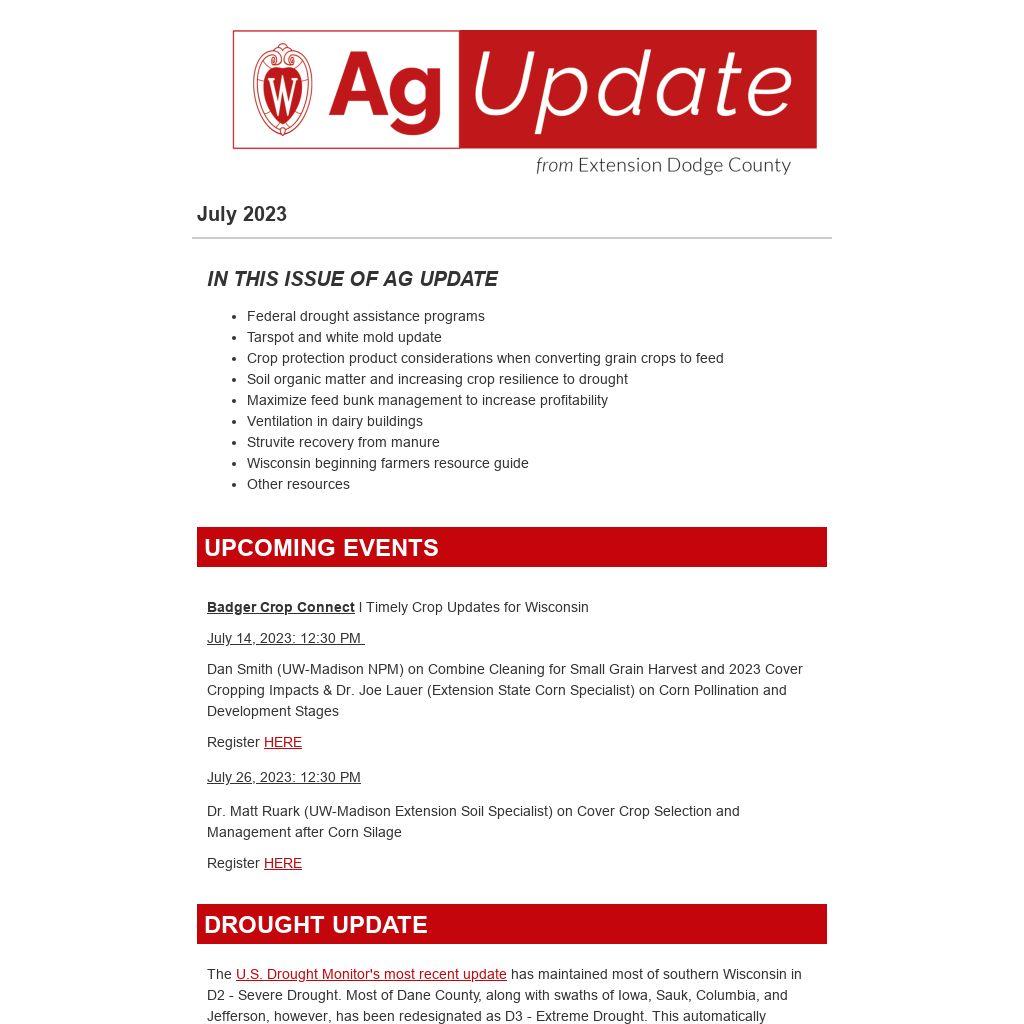 The U.S. Drought Monitor's most recent update has maintained most of southern Wisconsin in D2 - Severe Drought. Most of Dane County, along with swaths of Iowa, Sauk, Columbia, and Jefferson, however, has been redesignated as D3 - Extreme Drought. This automatically triggers several federal drought assistance programs for livestock and forage farmers, which you can learn more about HERE. Federal emergency loan programs have also been triggered for contiguous counties, which includes Dodge. Stay tuned to updates from FSA for more information on these programs.