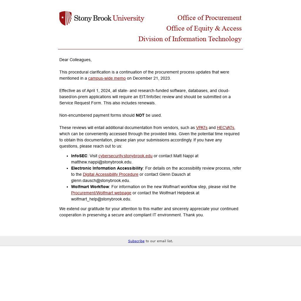 This procedural clarification is a continuation of the procurement process updates that were mentioned in a campus-wide memo on December 21, 2023.