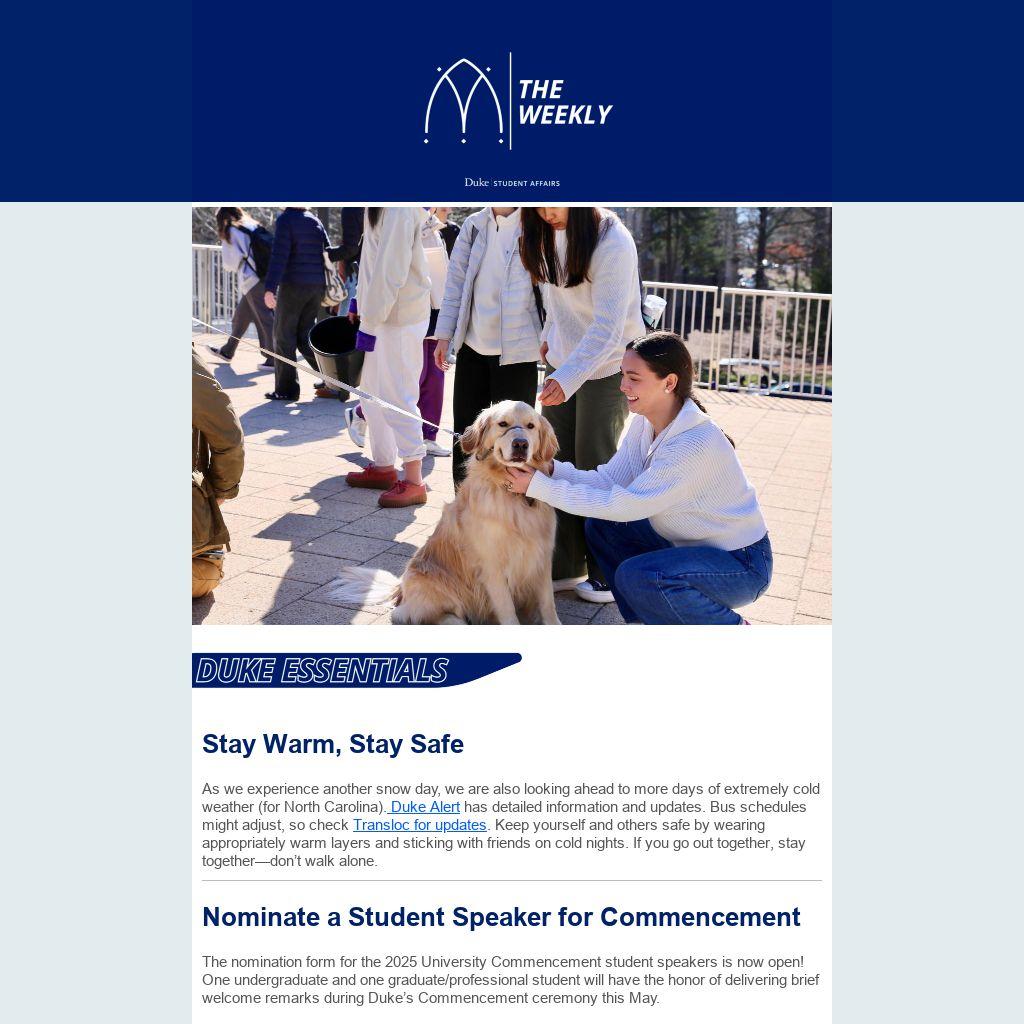 As we experience another snow day, we are also looking ahead to more days of extremely cold weather (for North Carolina). Duke Alert has detailed information and updates. Bus schedules might adjust, so check Transloc for updates. Keep yourself and others safe by wearing appropriately warm layers and sticking with friends on cold nights. If you go out together, stay together—don’t walk alone.