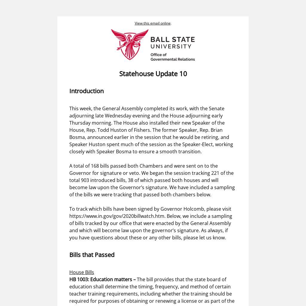 The Governmental Relations team would like to thank our on-campus colleagues for their expertise, assistance, and support during the 2020 legislative session. It is a pleasure to represent Ball State University at the Statehouse and to share the great work being done at our institution with policymakers. The efforts made by our students, staff, and faculty are recognized at the Statehouse.