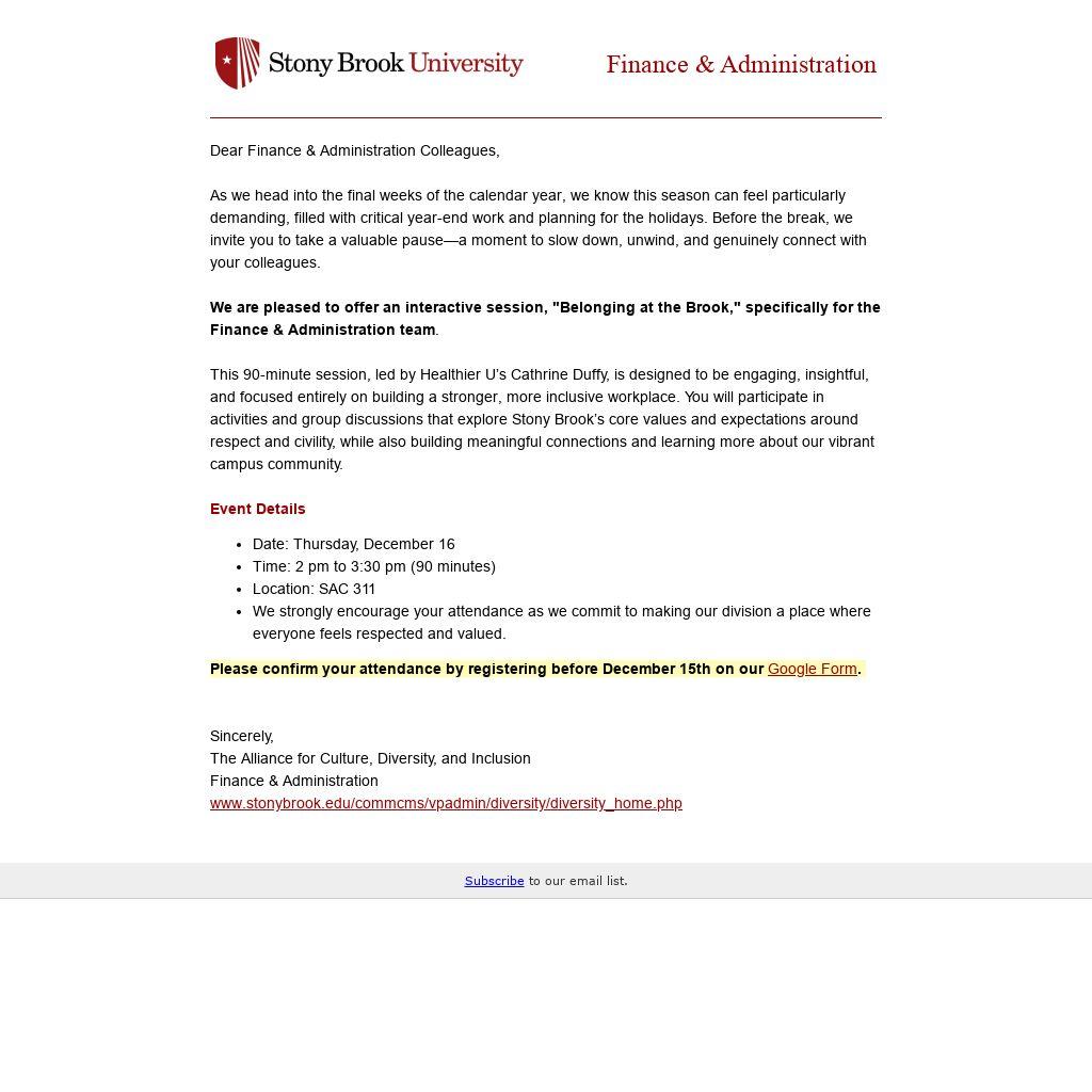 We are pleased to offer an interactive session, "Belonging at the Brook," specifically for the Finance & Administration team.