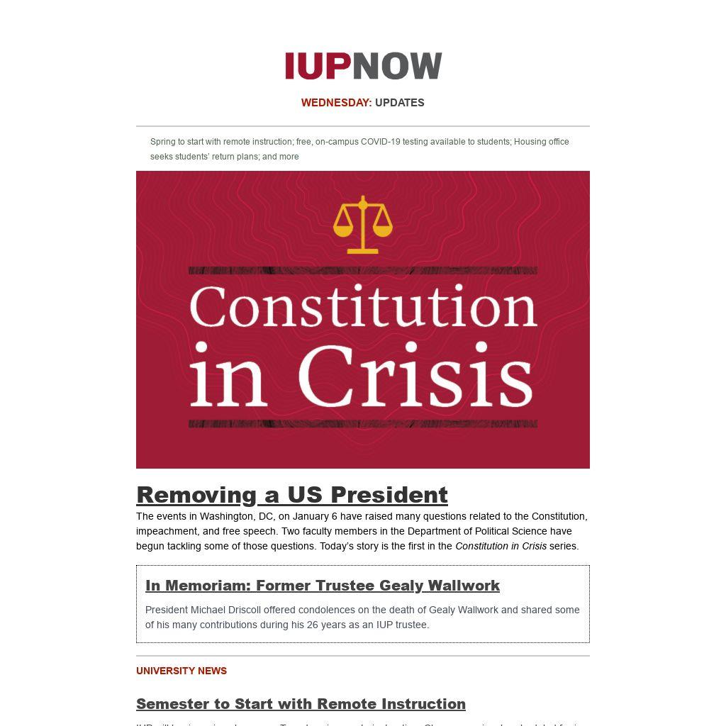 Distributed to IUP employees and students four days a week, IUP Now is the official newsletter of Indiana University of Pennsylvania. It features news from across the IUP website, compiled by the Division of Marketing and Communications. Find out how to get your news and events in IUP Now.