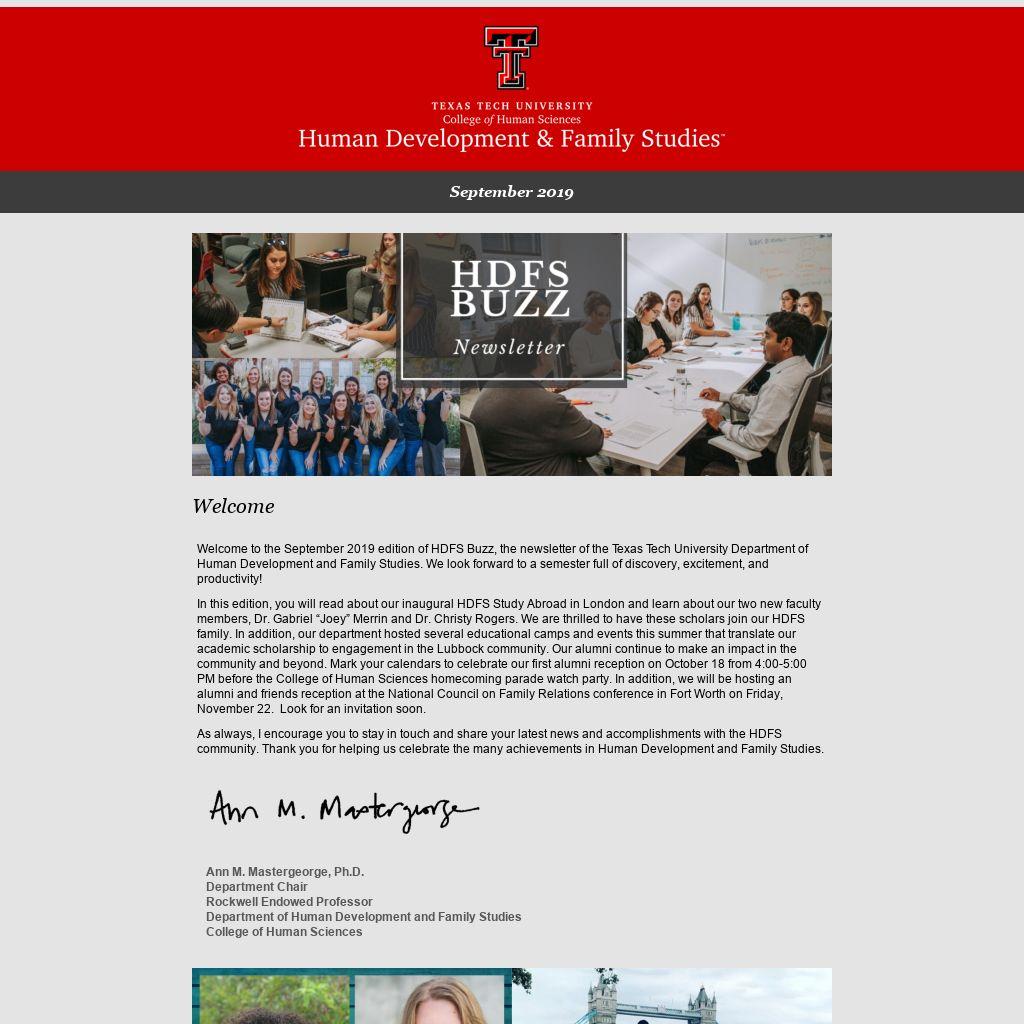 Welcome to the September 2019 edition of HDFS Buzz, the newsletter of the Texas Tech University Department of Human Development and Family Studies. We look forward to a semester full of discovery, excitement, and productivity!
