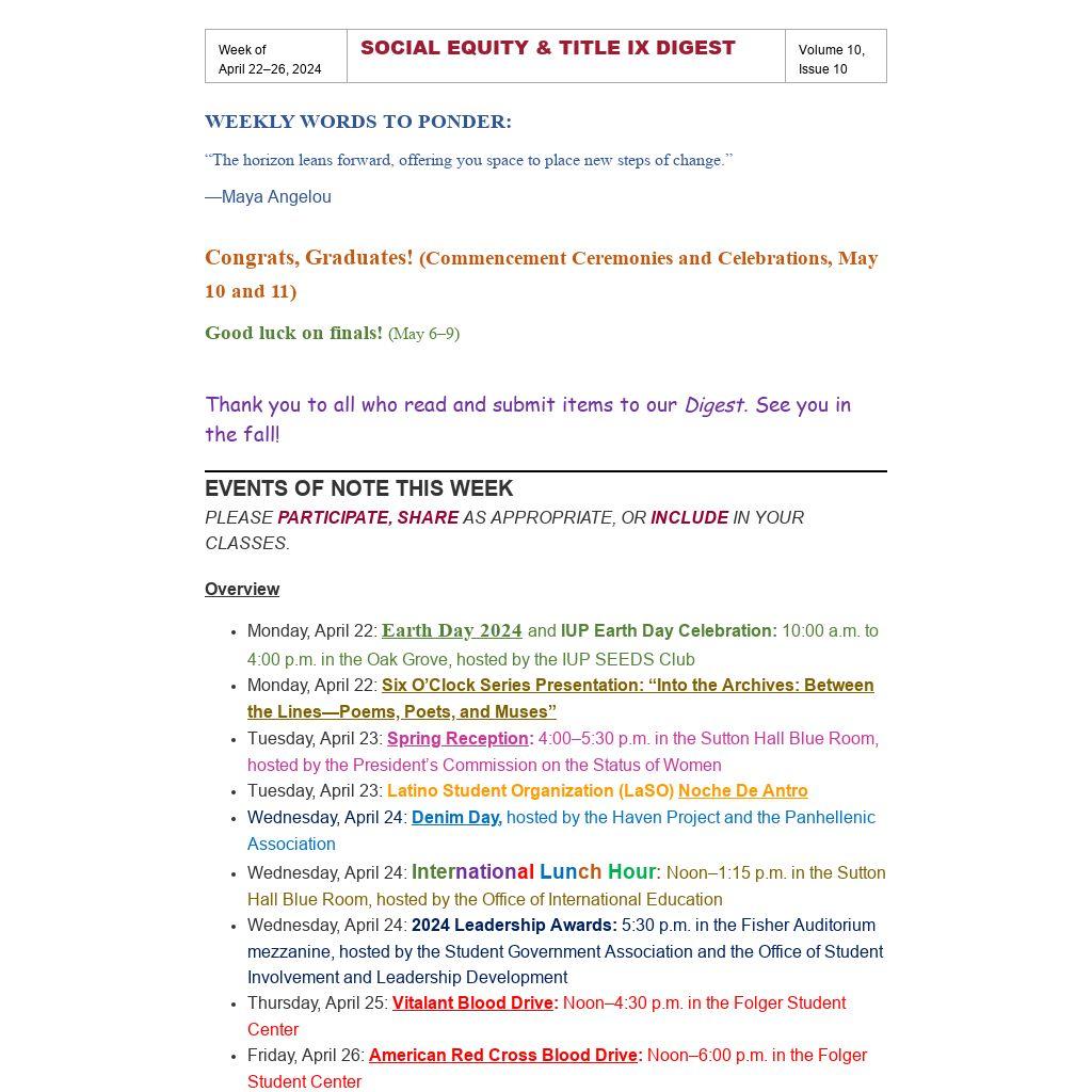 Tuesday, April 23: Spring Reception: 4:00–5:30 p.m. in the Sutton Hall Blue Room, hosted by the President’s Commission on the Status of Women