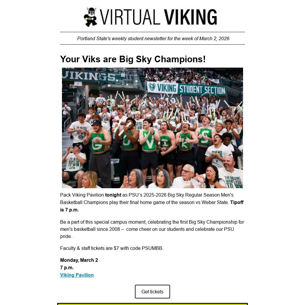 Virtual Viking is Portland State University's student newsletter, published weekly by University Communications. To submit a news item or event, email virtualv@pdx.edu.