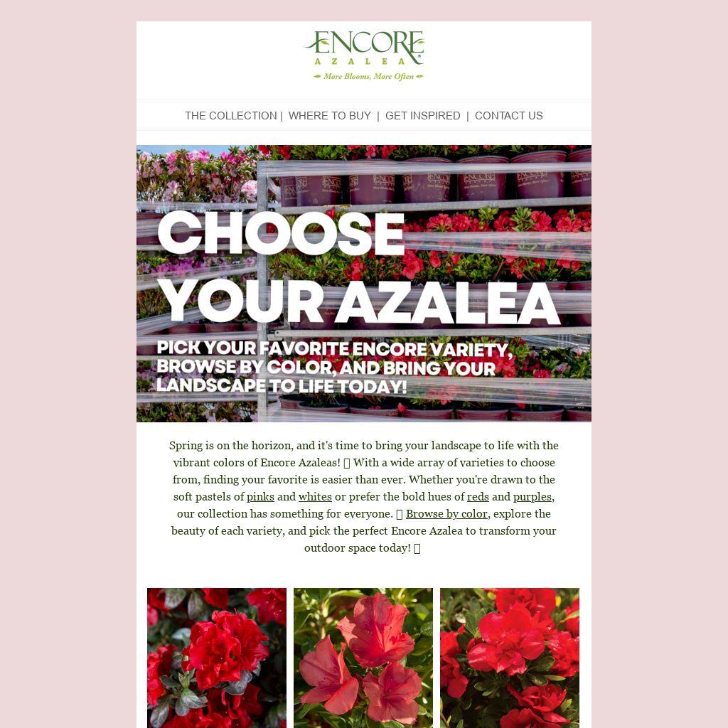 Spring is on the horizon, and it's time to bring your landscape to life with the vibrant colors of Encore Azaleas! 🎨 With a wide array of varieties to choose from, finding your favorite is easier than ever. Whether you're drawn to the soft pastels of pinks and whites or prefer the bold hues of reds and purples, our collection has something for everyone. 🌱 Browse by color, explore the beauty of each variety, and pick the perfect Encore Azalea to transform your outdoor space today! 🌟Â