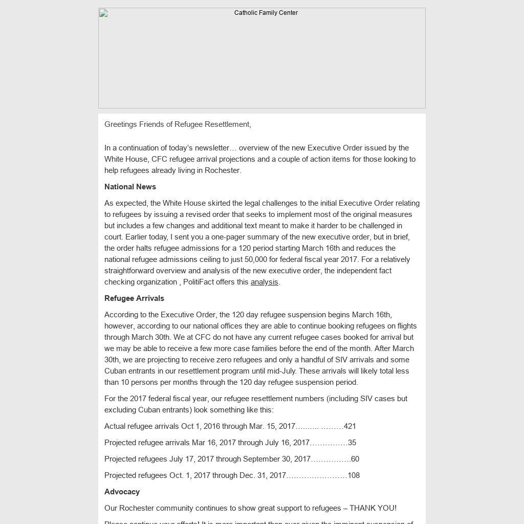 In a continuation of today’s newsletter… overview of the new Executive Order issued by the White House, CFC refugee arrival projections and a couple of action items for those looking to help refugees already living in Rochester.