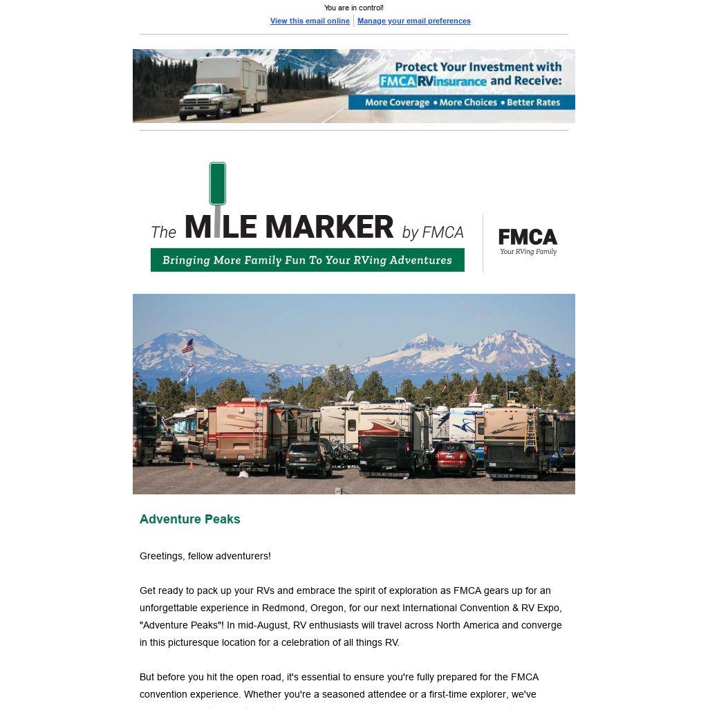 Get ready to pack up your RVs and embrace the spirit of exploration as FMCA gears up for an unforgettable experience in Redmond, Oregon, for our next International Convention & RV Expo, "Adventure Peaks"! In mid-August, RV enthusiasts will travel across North America and converge in this picturesque location for a celebration of all things RV.