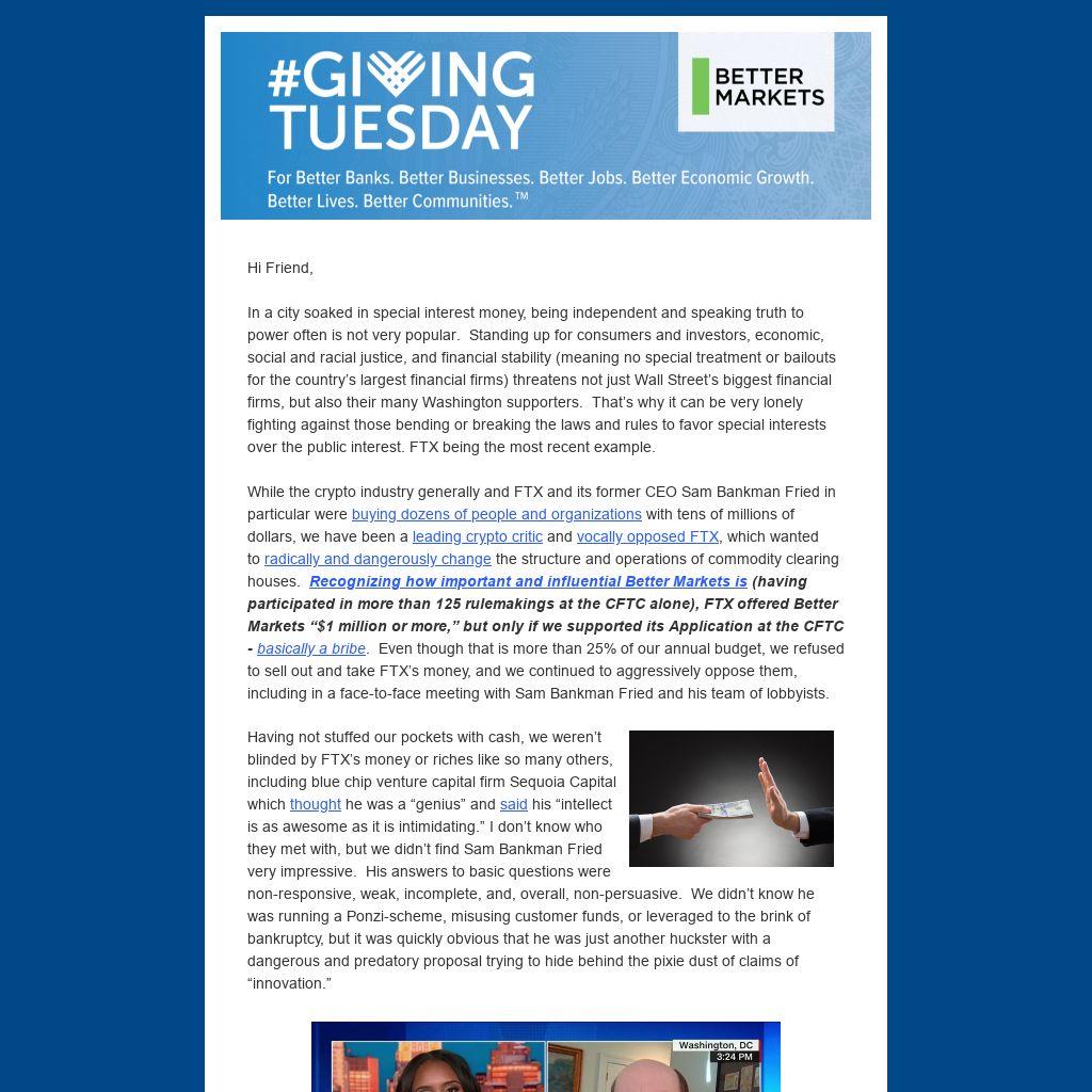| The FTX saga is a stark reminder that the only way to stand up to financial predators and their allies is for individuals and organizations to reject their money, maintain their independence and credibility, and speak out about their activities and the dangers they pose. Better Markets has done that with FTX and the crypto industry, just as we have stood up to Wall Street for more than a decade.
