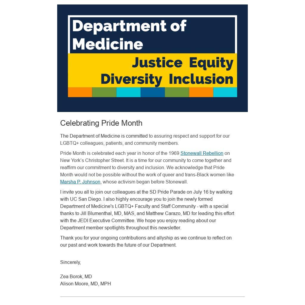 I invite you all to join our colleagues at the SD Pride Parade on July 16 by walking with UC San Diego. I also highly encourage you to join the newly formed Department of Medicine's LGBTQ+ Faculty and Staff Community - with a special thanks to Jill Blumenthal, MD, MAS, and Matthew Carazo, MD for leading this effort with the JEDI Executive Committee. We hope you enjoy reading about our Department member spotlights throughout this newsletter.