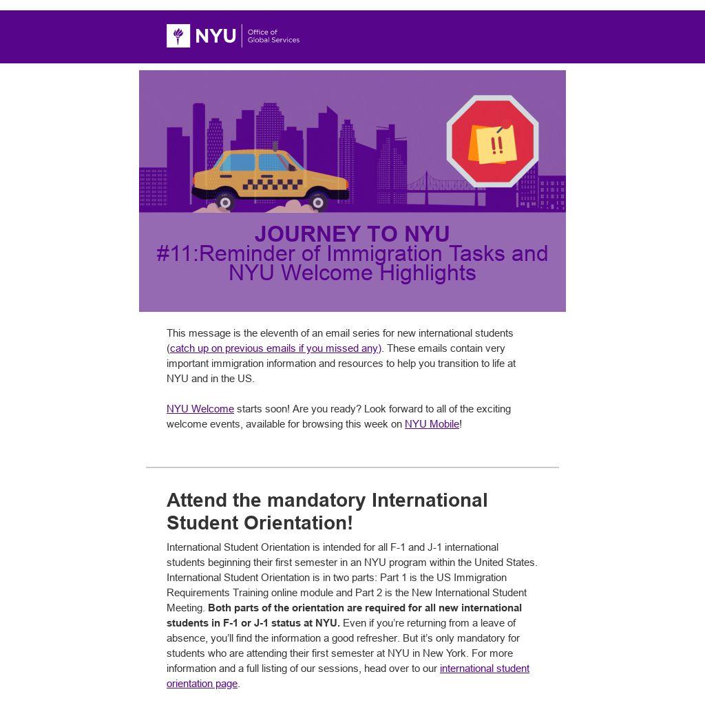 This message is the eleventh of an email series for new international students ( catch up on previous emails if you missed any). These emails contain very important immigration information and resources to help you transition to life at NYU and in the US.