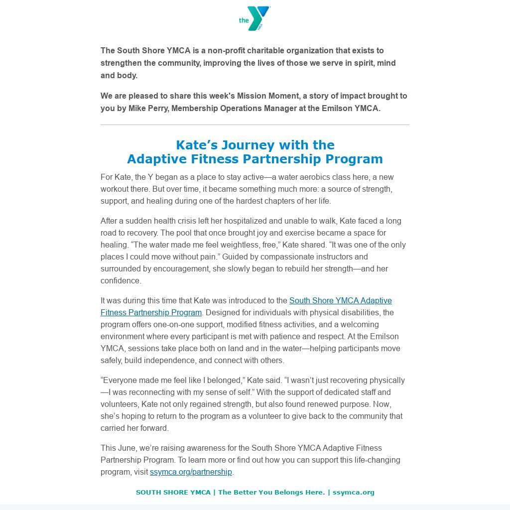 It was during this time that Kate was introduced to the South Shore YMCA Adaptive Fitness Partnership Program. Designed for individuals with physical disabilities, the program offers one-on-one support, modified fitness activities, and a welcoming environment where every participant is met with patience and respect. At the Emilson YMCA, sessions take place both on land and in the water—helping participants move safely, build independence, and connect with others.