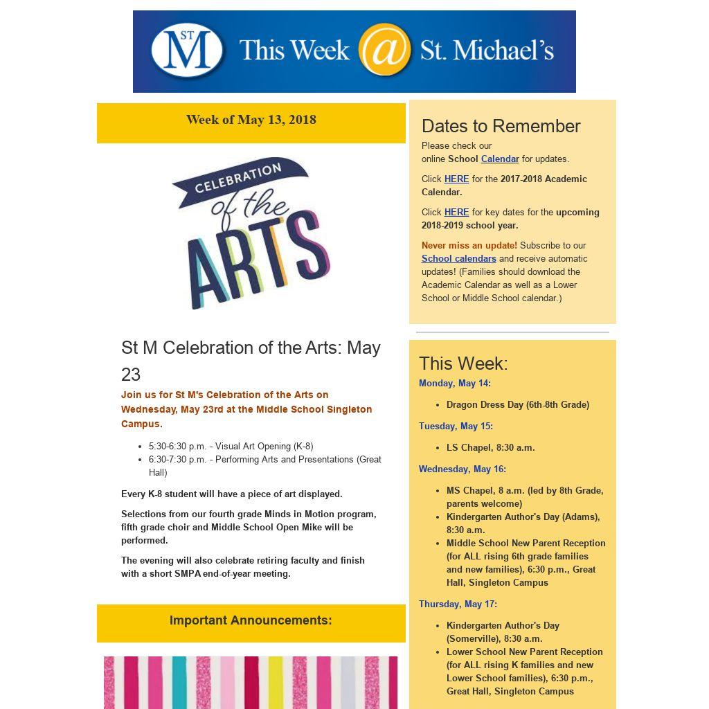 Join us for St M's Celebration of the Arts on Wednesday, May 23rd at the Middle School Singleton Campus. - 5:30-6:30 p.m. - Visual Art Opening (K-8)