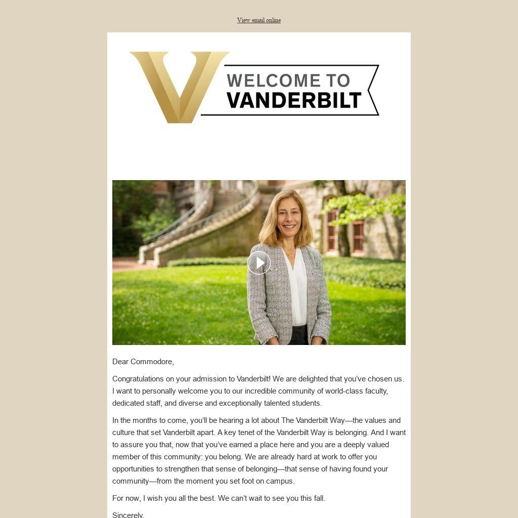 Congratulations on your admission to Vanderbilt! We are delighted that you’ve chosen us. I want to personally welcome you to our incredible community of world-class faculty, dedicated staff, and diverse and exceptionally talented students.