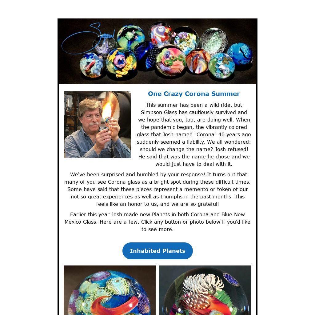 Earlier this year Josh made new Planets in both Corona and Blue New Mexico Glass. Here are a few. Click any button or photo below if you'd like to see more.