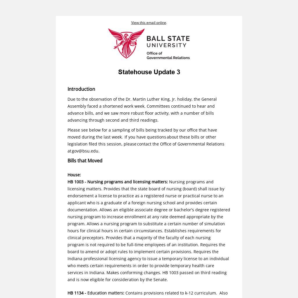 Please see below for a sampling of bills being tracked by our office that have moved during the last week. If you have questions about these bills or other legislation filed this session, please contact the Office of Governmental Relations at gov@bsu.edu.