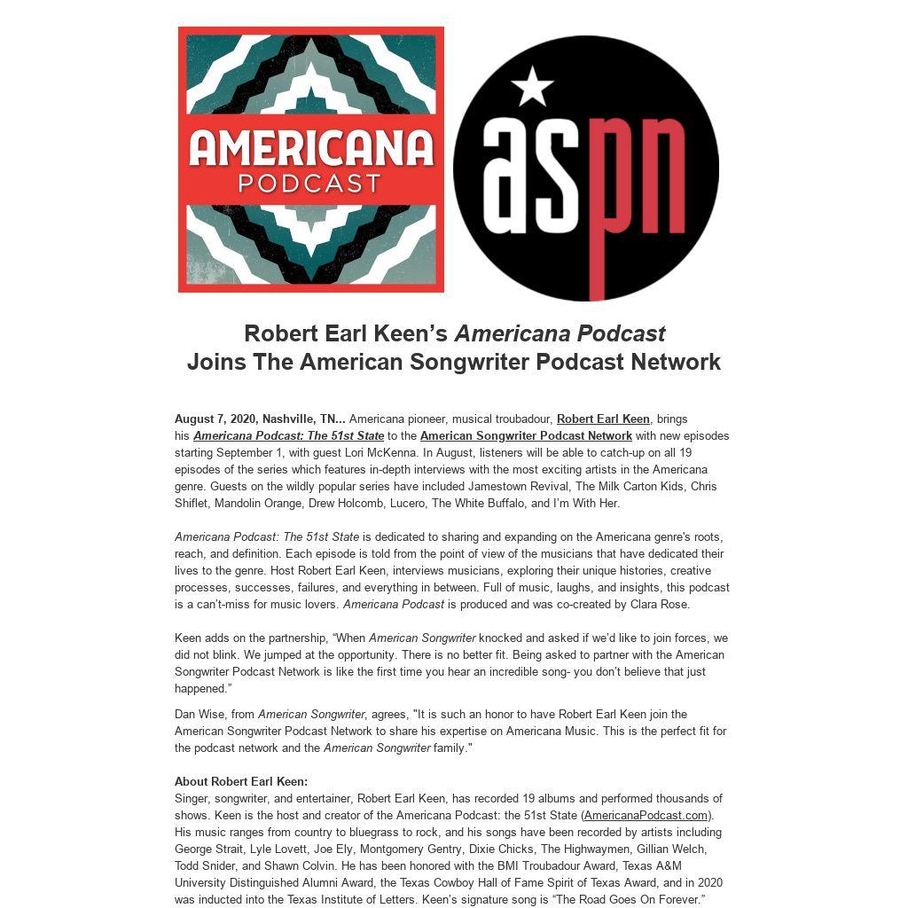 Dan Wise, from American Songwriter, agrees, "It is such an honor to have Robert Earl Keen join the American Songwriter Podcast Network to share his expertise on Americana Music. This is the perfect fit for the podcast network and the American Songwriter family."