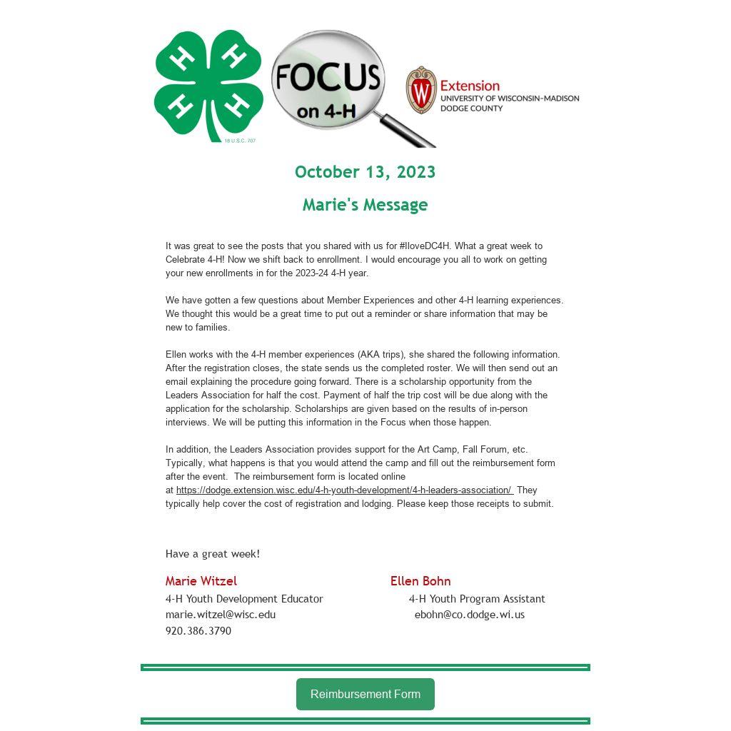 4-H Youth Development Educator 4-H Youth Program Assistant marie.witzel@wisc.edu ebohn@co.dodge.wi.us 920.386.3790