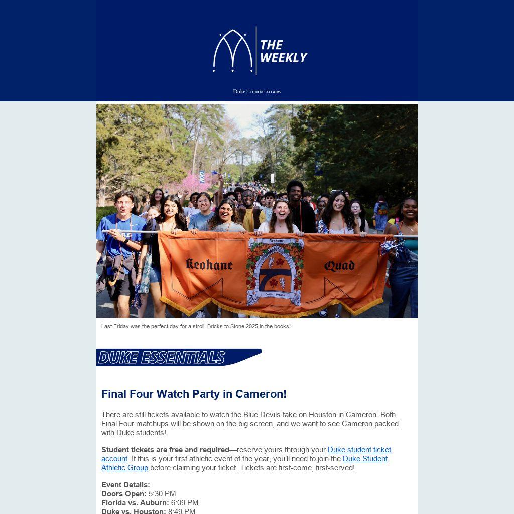 There are still tickets available to watch the Blue Devils take on Houston in Cameron. Both Final Four matchups will be shown on the big screen, and we want to see Cameron packed with Duke students!