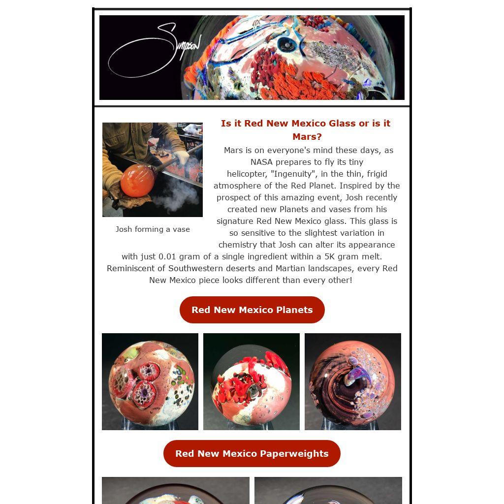 Mars is on everyone's mind these days, as NASA prepares to fly its tiny helicopter, "Ingenuity", in the thin, frigid atmosphere of the Red Planet. Inspired by the prospect of this amazing event, Josh recently created new Planets and vases from his signature Red New Mexico glass. This glass is so sensitive to the slightest variation in chemistry that Josh can alter its appearance with just 0.01 gram of a single ingredient within a 5K gram melt. Reminiscent of Southwestern deserts and Martian landscapes, every Red New Mexico piece looks different than every other!