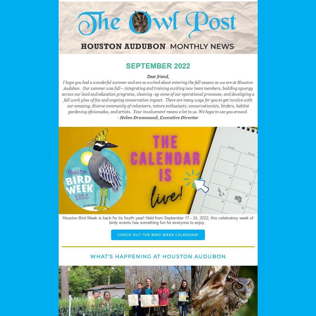 I hope you had a wonderful summer and are as excited about entering the fall season as we are at Houston Audubon. Our summer was full— integrating and training exciting new team members, building synergy across our land and education programs, cleaning -up some of our operational processes, and developing a fall work plan of fun and ongoing conservation impact. There are many ways for you to get involve with our amazing, diverse community of volunteers, nature enthusiasts, conservationists, birders, habitat gardening aficionados, and artists. Your involvement means a lot to us. We hope to see you around.