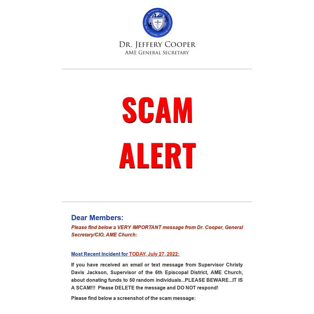 If you have received an email or text message from Supervisor Christy Davis Jackson, Supervisor of the 6th Episcopal District, AME Church, about donating funds to 50 random individuals...PLEASE BEWARE...IT IS A SCAM!!! Please DELETE the message and DO NOT respond!