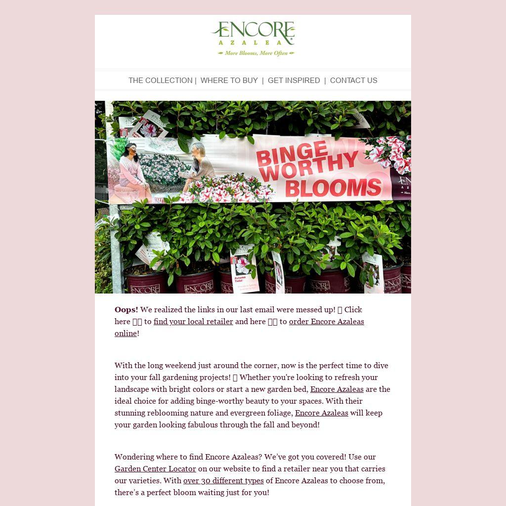 With the long weekend just around the corner, now is the perfect time to dive into your fall gardening projects! 🍁 Whether you're looking to refresh your landscape with bright colors or start a new garden bed, Encore Azaleas are the ideal choice for adding binge-worthy beauty to your spaces. With their stunning reblooming nature and evergreen foliage, Encore Azaleas will keep your garden looking fabulous through the fall and beyond!
