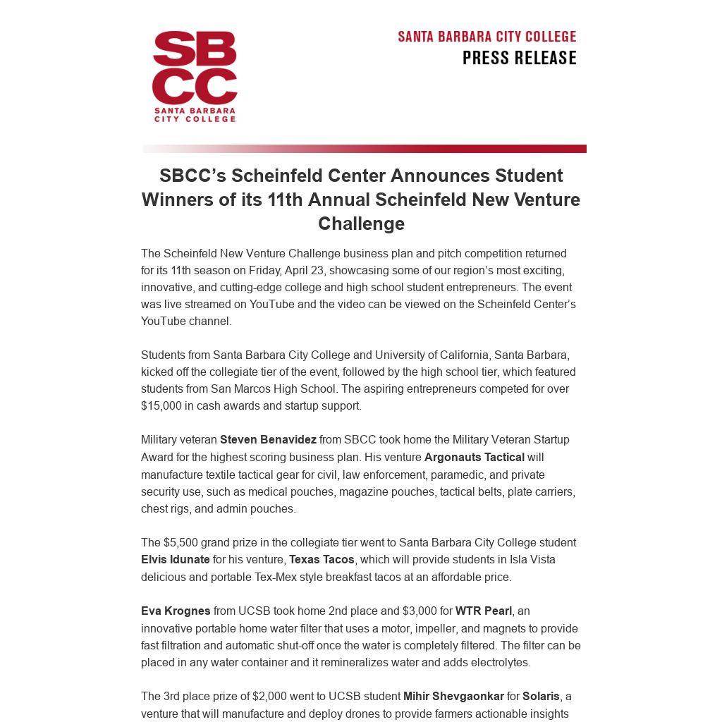 The SBCC Scheinfeld Center for Entrepreneurship & Innovation is a hub for entrepreneurial development within the South Central Coast community and is a resource for model programs for other California community college districts. The Scheinfeld Center, part of the Jack & Julie Nadel School of Business & Entrepreneurship at SBCC, trains globally competent entrepreneurs using a comprehensive approach that includes academics, hands-on experience, and support. Participants can build their business in the classroom and shore up gaps in their entrepreneurial skill set through the Scheinfeld Center’s distinctive combination of coursework, business plan and pitch competitions, industry internships, no-cost business consulting, mentoring, networking, and post-startup support. To learn more, visit www.scheinfeld.sbcc.edu
