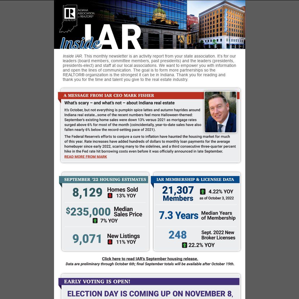 Inside IAR. This monthly newsletter is an activity report from your state association. It’s for our leaders (board members, committee members, past presidents) and the leaders (presidents, presidents-elect) and staff at our local associations. We want to empower you with information and open the lines of communication. The goal is to form more partnerships so the REALTOR® organization is the strongest it can be in Indiana. Thank you for reading and thank you for the time and talent you give to the real estate industry.