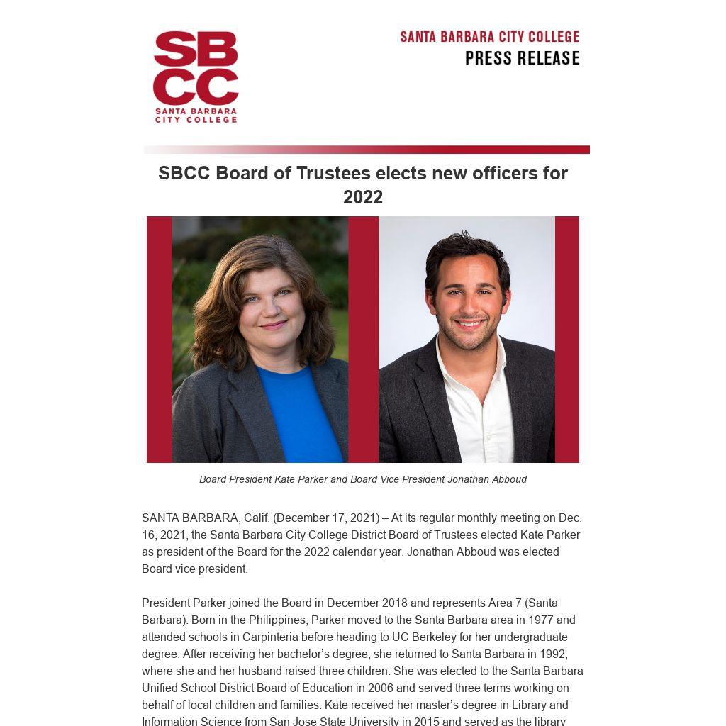 SANTA BARBARA, Calif. (December 17, 2021) – At its regular monthly meeting on Dec. 16, 2021, the Santa Barbara City College District Board of Trustees elected Kate Parker as president of the Board for the 2022 calendar year. Jonathan Abboud was elected Board vice president.