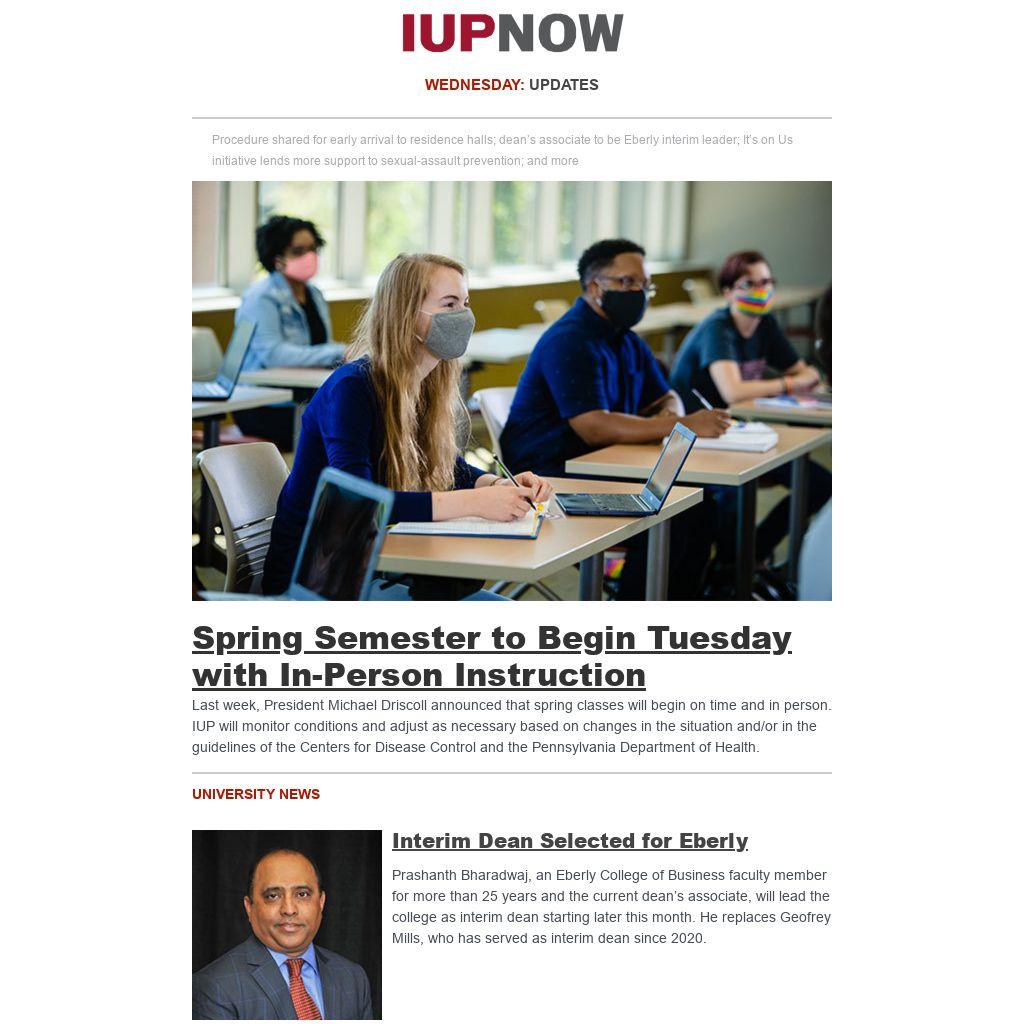Distributed to IUP employees and students three days a week, IUP Now is the official newsletter of Indiana University of Pennsylvania. It features news from across the IUP website, compiled by the Division of Marketing and Communications. Find out how to get your news and events in IUP Now.