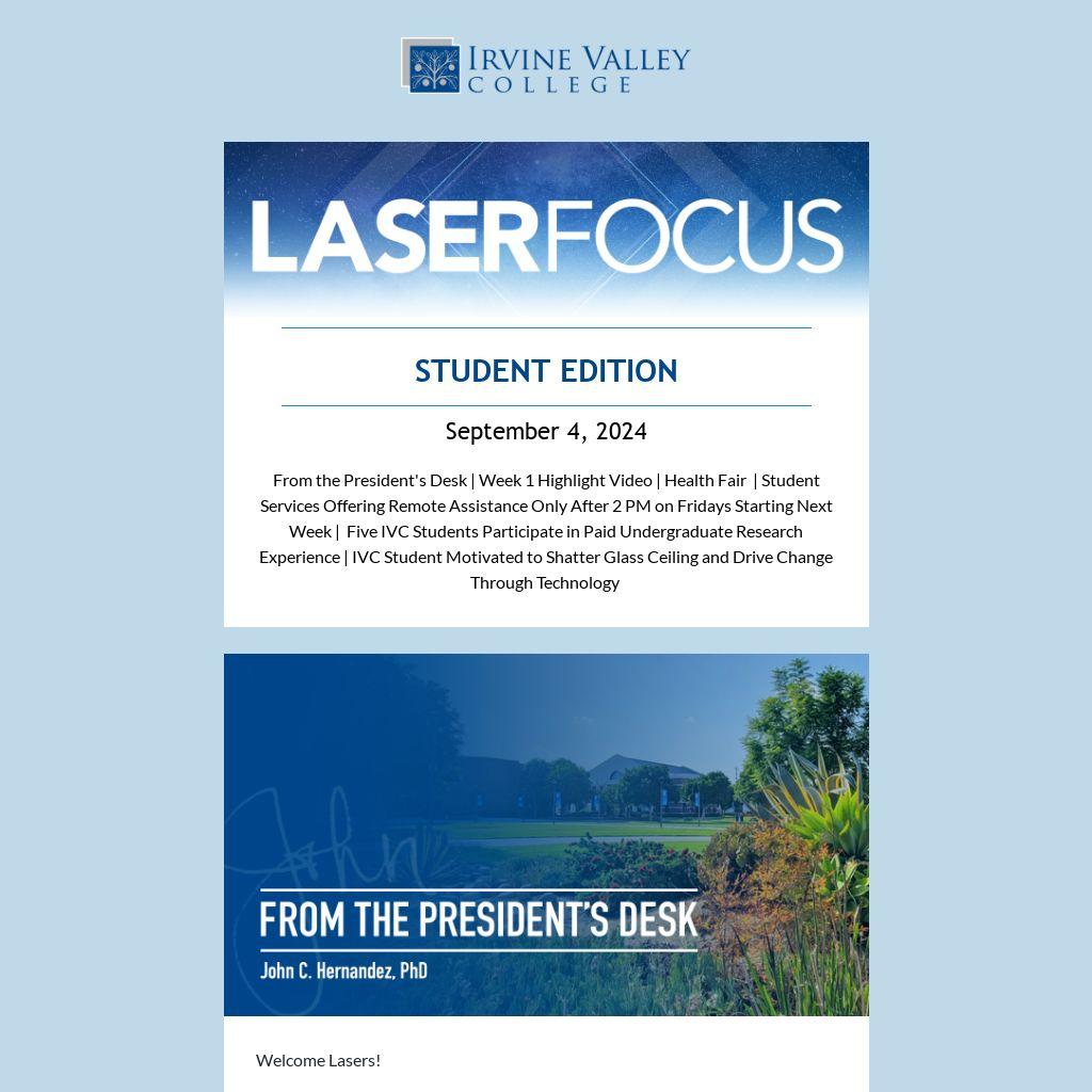 From the President's Desk | Week 1 Highlight Video | Health Fair | Student Services Offering Remote Assistance Only After 2 PM on Fridays Starting Next Week | Five IVC Students Participate in Paid Undergraduate Research Experience | IVC Student Motivated to Shatter Glass Ceiling and Drive Change Through Technology