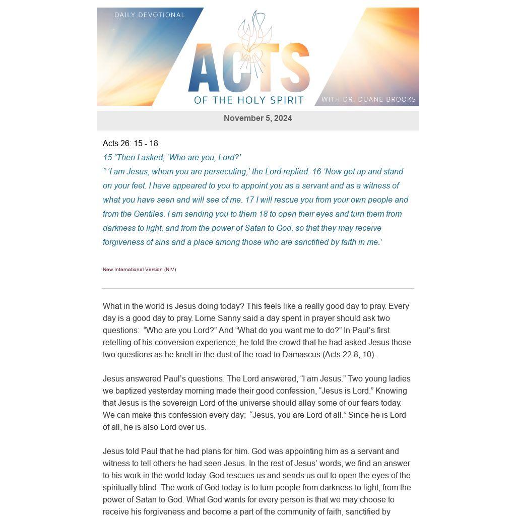 What in the world is Jesus doing today? This feels like a really good day to pray. Every day is a good day to pray. Lorne Sanny said a day spent in prayer should ask two questions: “Who are you Lord?” And “What do you want me to do?” In Paul’s first retelling of his conversion experience, he told the crowd that he had asked Jesus those two questions as he knelt in the dust of the road to Damascus (Acts 22:8, 10).