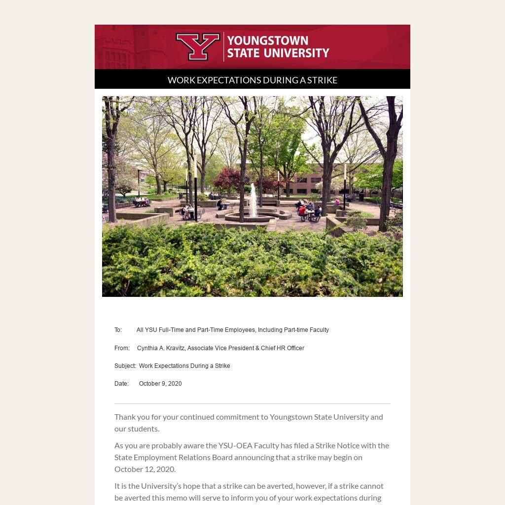 As you are probably aware the YSU-OEA Faculty has filed a Strike Notice with the State Employment Relations Board announcing that a strike may begin on October 12, 2020.