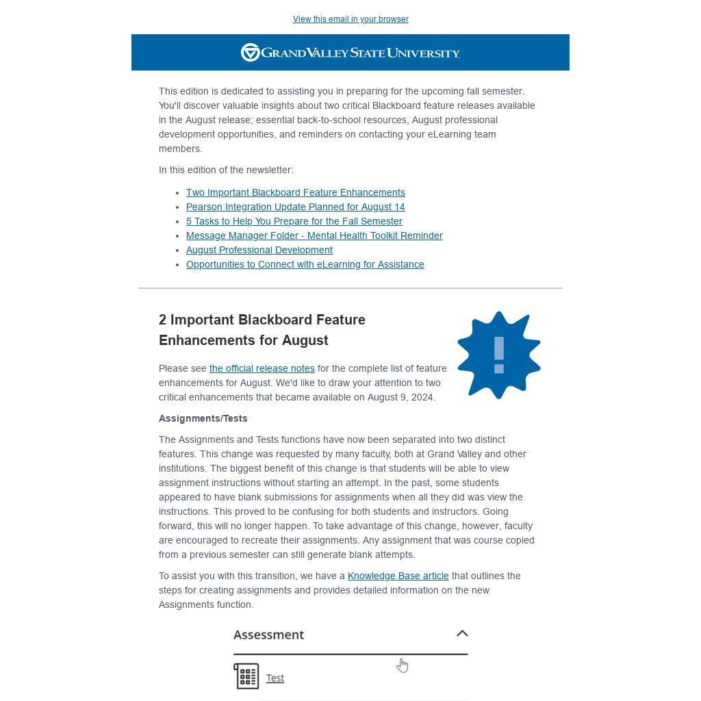 This edition is dedicated to assisting you in preparing for the upcoming fall semester. You'll discover valuable insights about two critical Blackboard feature releases available in the August release; essential back-to-school resources, August professional development opportunities, and reminders on contacting your eLearning team members.