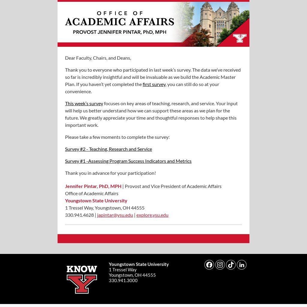 This week’s survey focuses on key areas of teaching, research, and service. Your input will help us better understand how we can support these areas as we plan for the future. We greatly appreciate your time and thoughtful responses to help shape this important work.