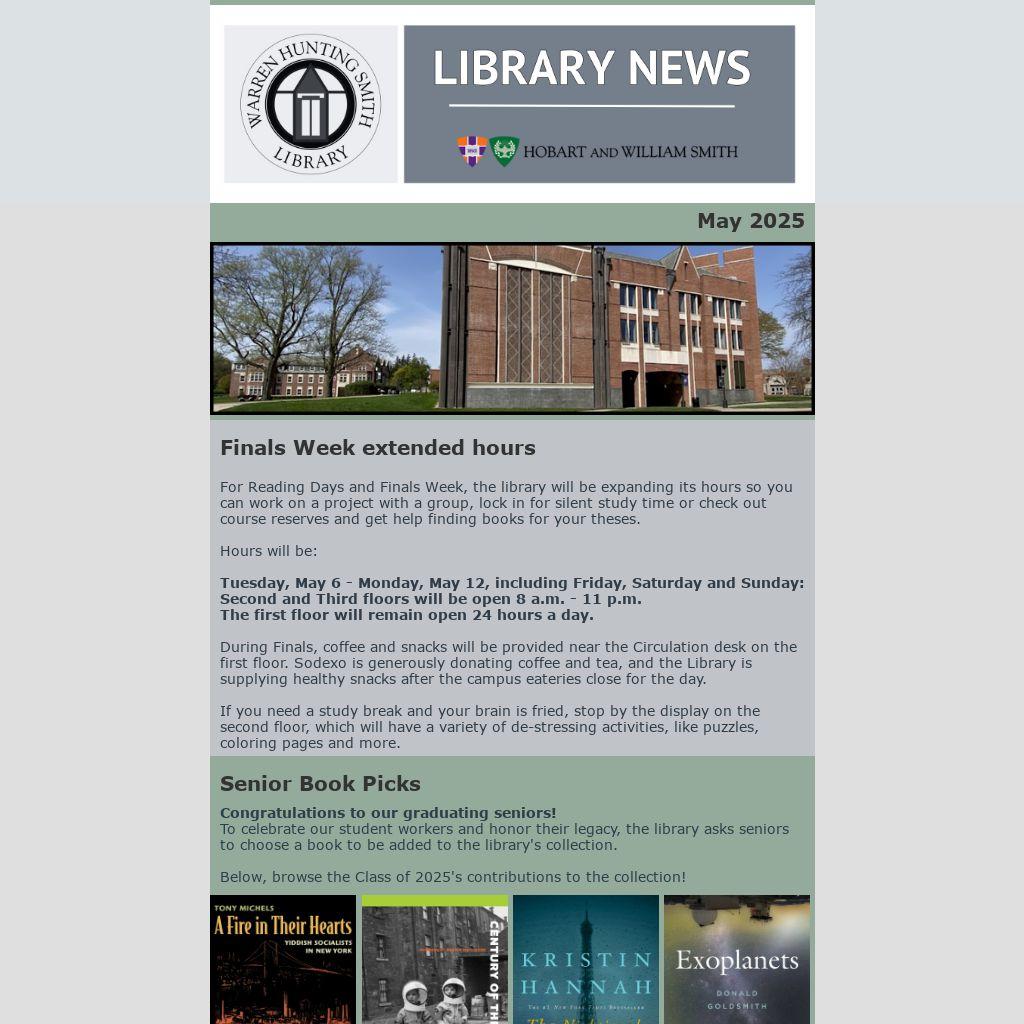 During Finals, coffee and snacks will be provided near the Circulation desk on the first floor. Sodexo is generously donating coffee and tea, and the Library is supplying healthy snacks after the campus eateries close for the day.