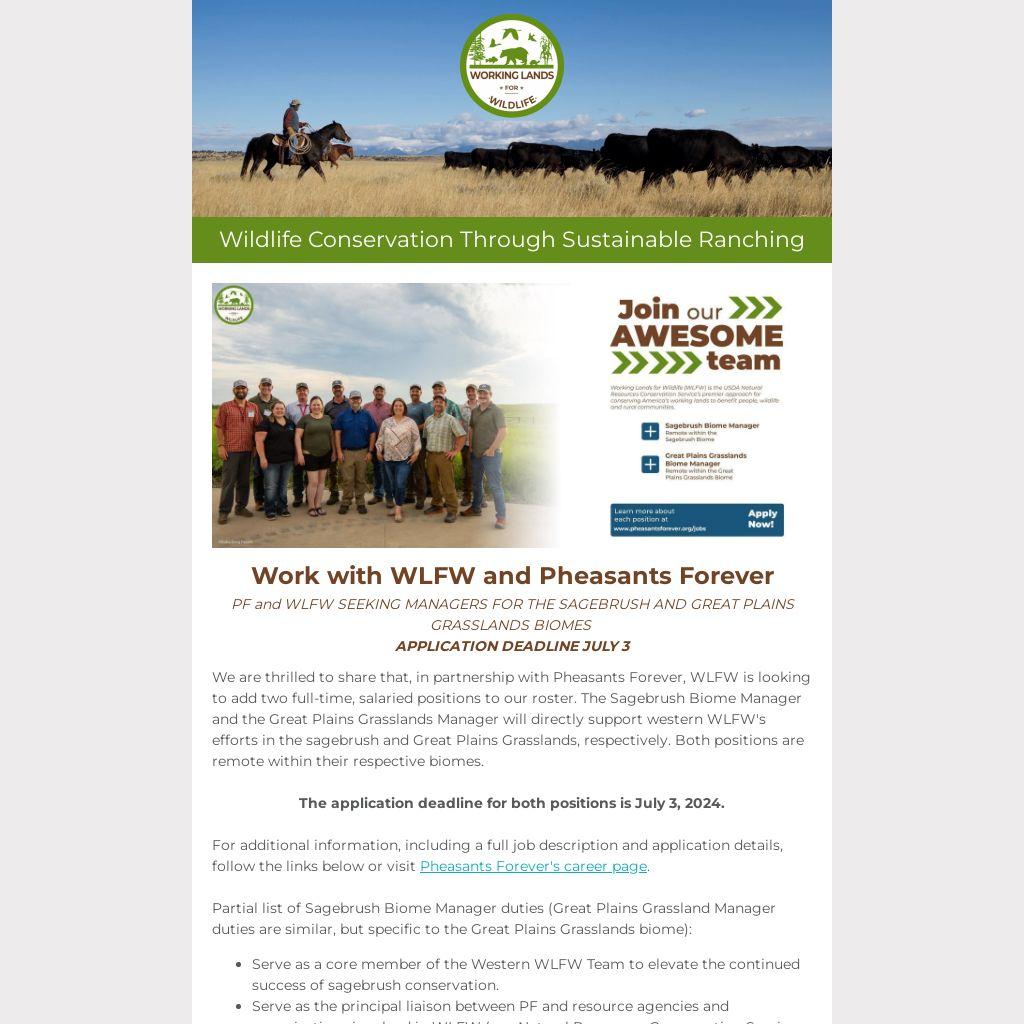 We are thrilled to share that, in partnership with Pheasants Forever, WLFW is looking to add two full-time, salaried positions to our roster. The Sagebrush Biome Manager and the Great Plains Grasslands Manager will directly support western WLFW's efforts in the sagebrush and Great Plains Grasslands, respectively. Both positions are remote within their respective biomes.