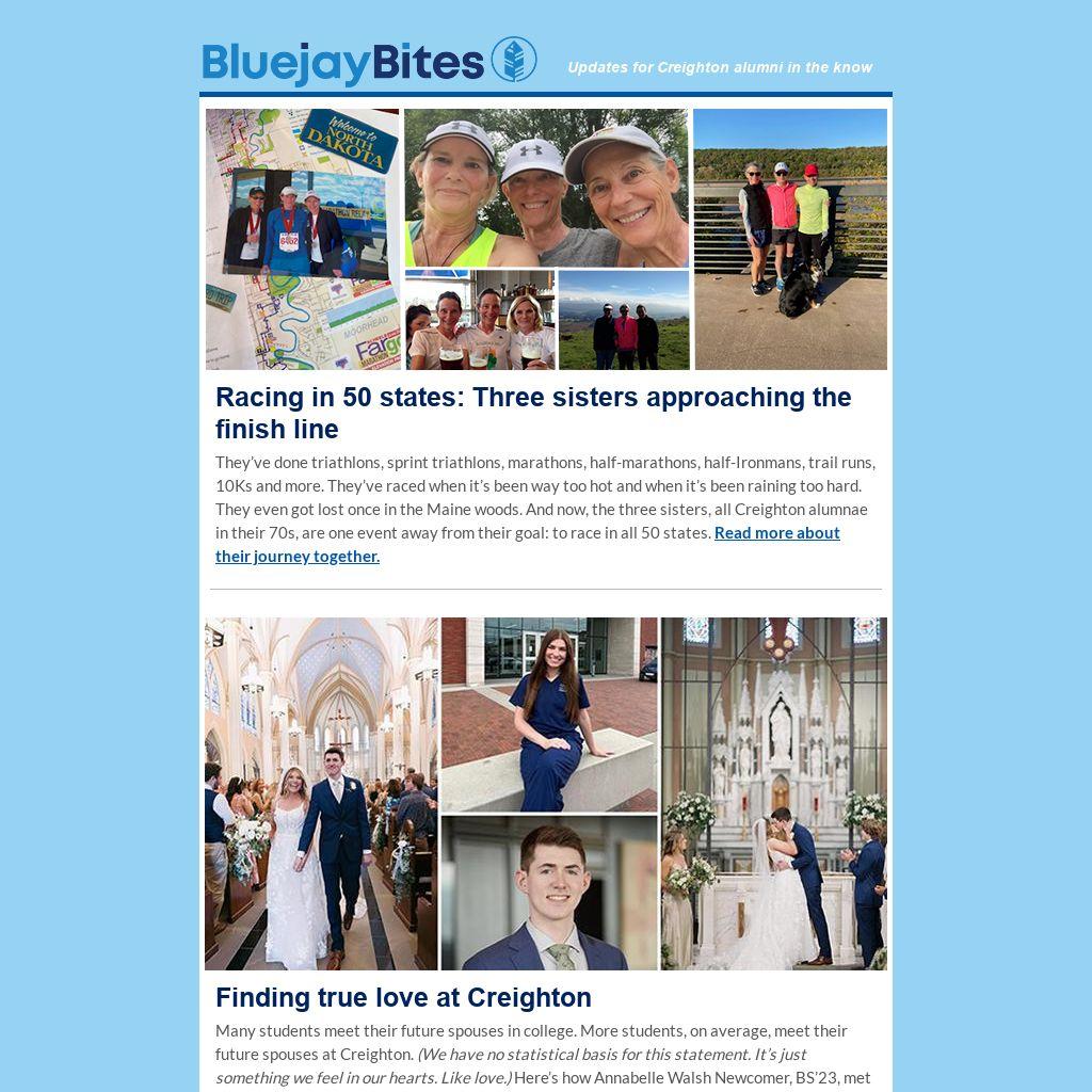They’ve done triathlons, sprint triathlons, marathons, half-marathons, half-Ironmans, trail runs, 10Ks and more. They’ve raced when it’s been way too hot and when it’s been raining too hard. They even got lost once in the Maine woods. And now, the three sisters, all Creighton alumnae in their 70s, are one event away from their goal: to race in all 50 states. Read more about their journey together.