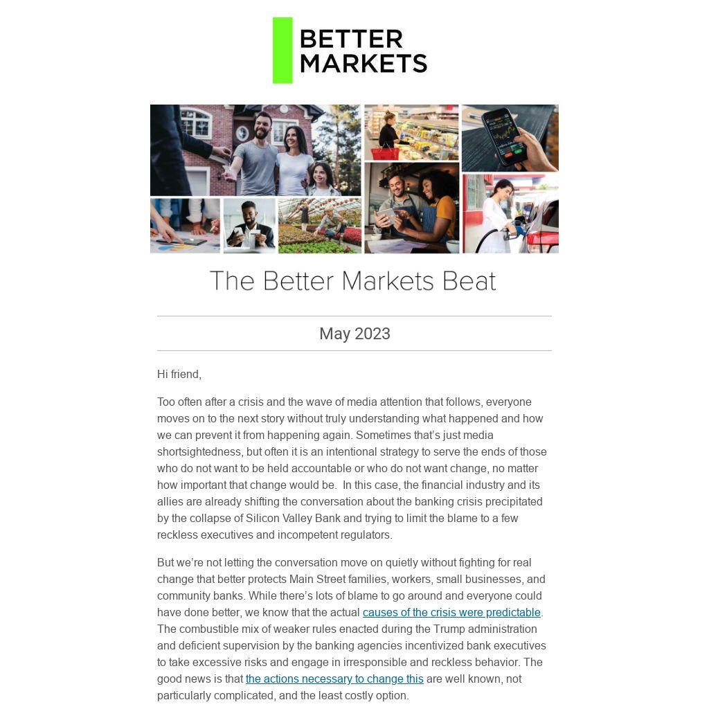 On a closing note, Better Markets is moving! After 13 years, this is the last month in our K Street office. Our new office will be located at 2000 Pennsylvania Avenue NW, Suite 4008, Washington, DC, 20006.