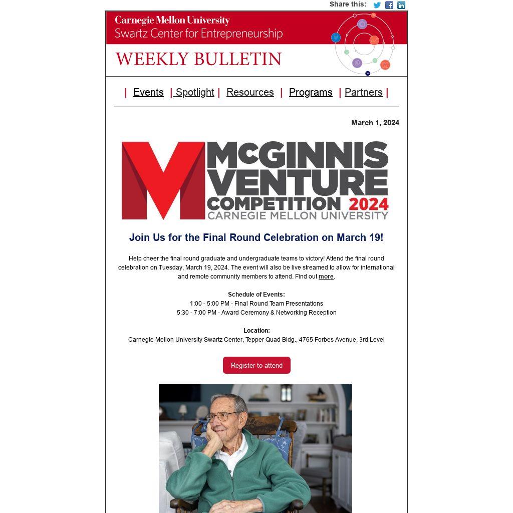 Have startup news or opportunities to share? Have questions about the Swartz Center Weekly Bulletin? Send news, opportunities or questions to Sonya Ford, Program Manager.