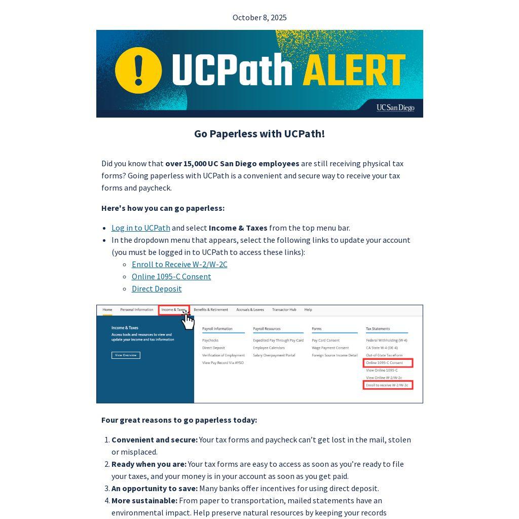 Did you know that over 15,000 UC San Diego employees are still receiving physical tax forms? Going paperless with UCPath is a convenient and secure way to receive your tax forms and paycheck.