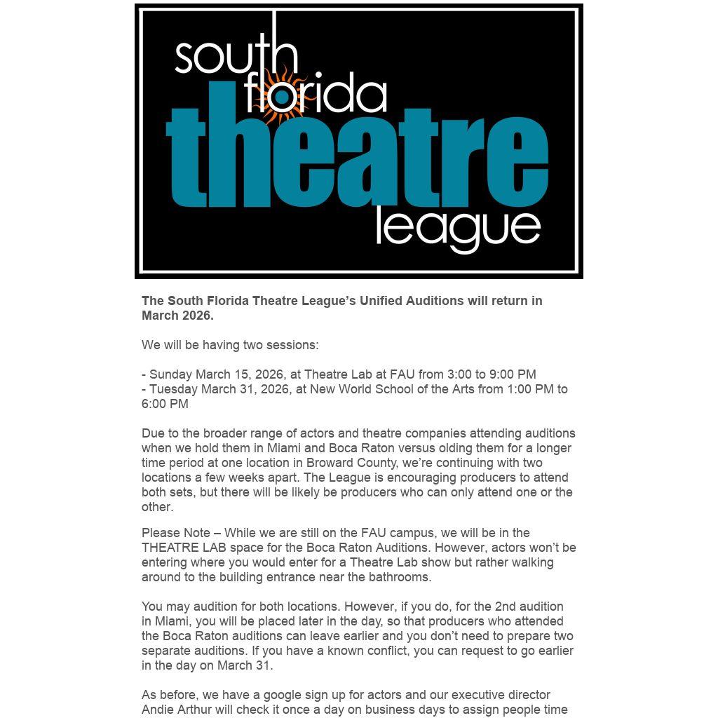 Please contact Andie Arthur at andie@southfloridatheatre.com and she will get you set up. We are not providing a dinner break this year, but we will be providing snacks, so please note any dietary restrictions.