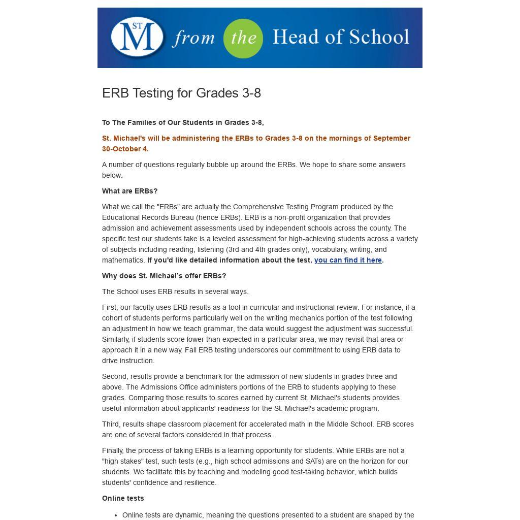 St. Michael's will be administering the ERBs to Grades 3-8 on the mornings of September 30-October 4.