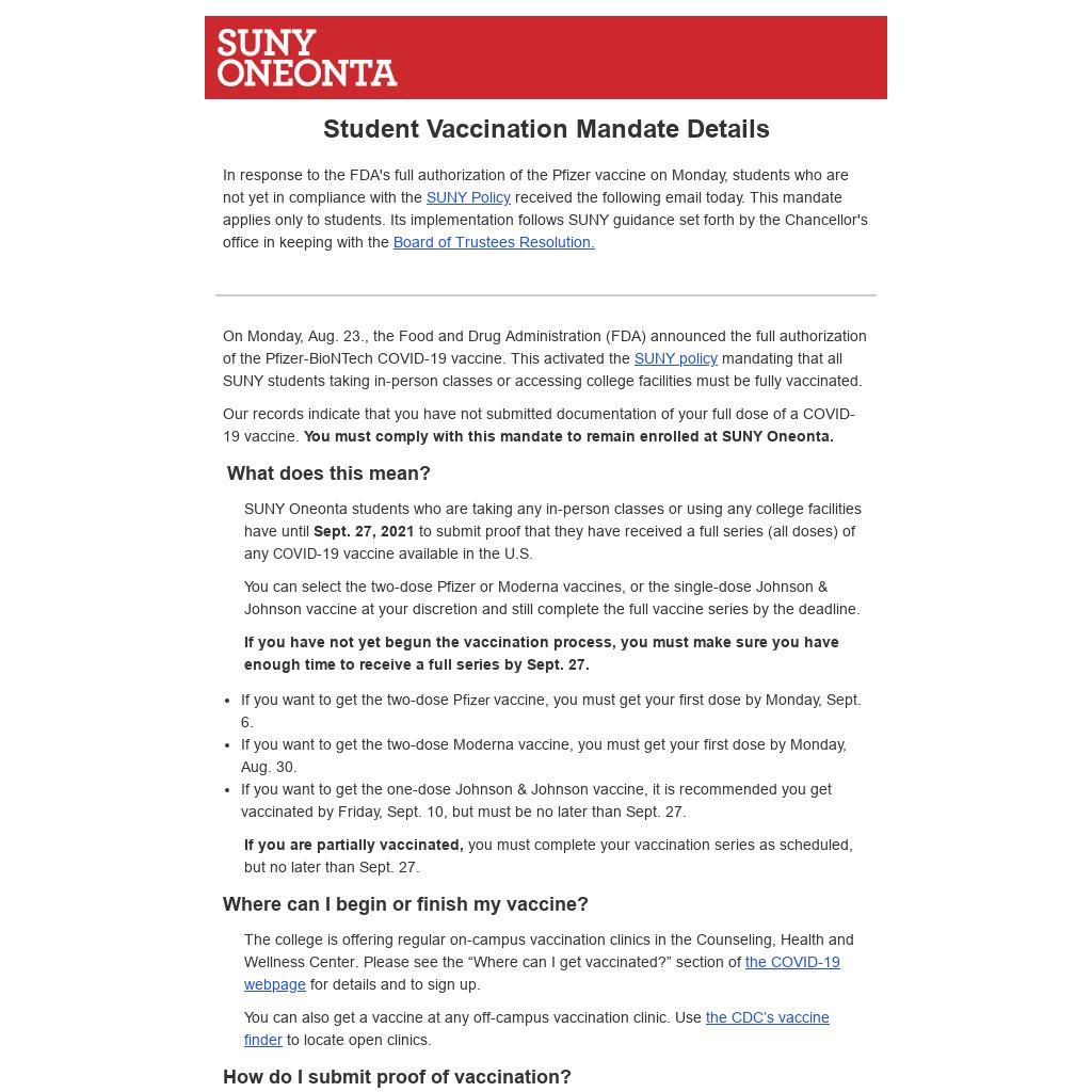 Our records indicate that you have not submitted documentation of your full dose of a COVID-19 vaccine. You must comply with this mandate to remain enrolled at SUNY Oneonta.