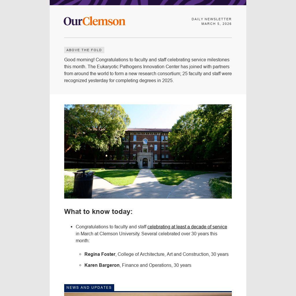 Good morning! Congratulations to faculty and staff celebrating service milestones this month. The Eukaryotic Pathogens Innovation Center has joined with partners from around the world to form a new research consortium; 25 faculty and staff were recognized yesterday for completing degrees in 2025.