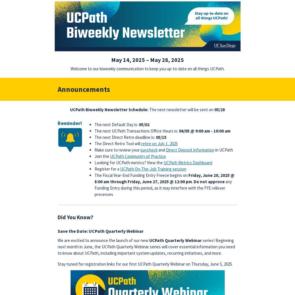 UCPath Biweekly Newsletter Schedule: The next newsletter will be sent on 05/28 |